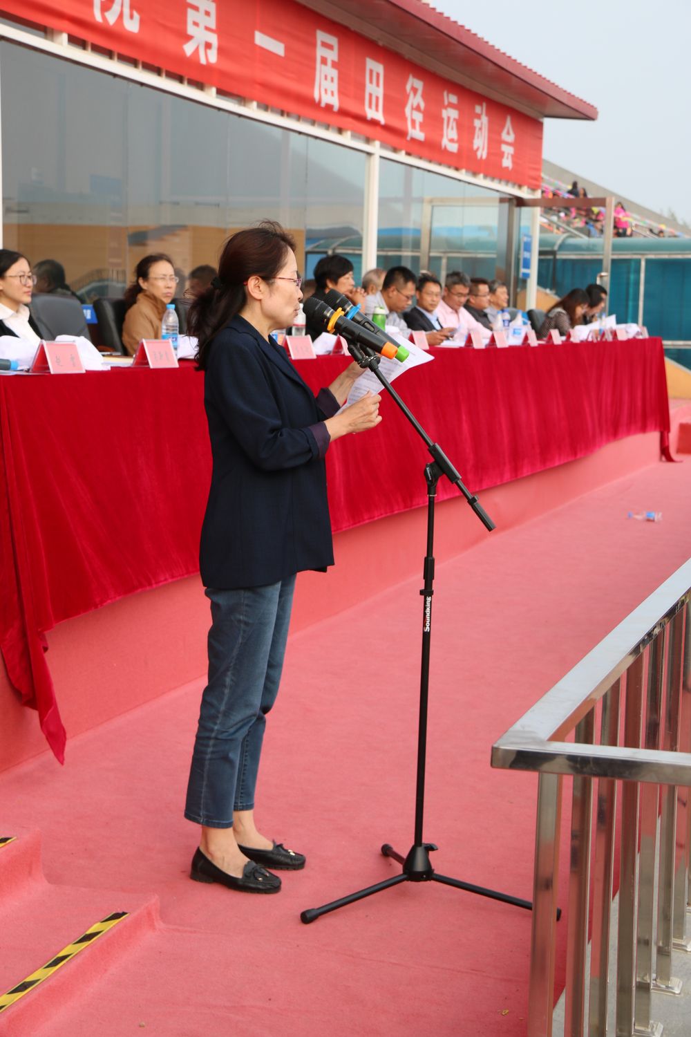 在颁奖典礼过后,党总支书记王一女致闭幕词。王书记代表学校向取得优异成绩的各单位和运动员致以热烈祝贺,向付出辛勤汗水的裁判员、工作人员表示了衷心感谢。她指出,我校第一届田径运动会的圆满举行,充分反映了我校体育事业蓬勃发展、教育教学水平不断提高的良好态势,全面展示了我校各项事业健康、和谐发展的喜人成就,是一次高标准、高质量、高水平的大会,取得了运动成绩和精神文明的双丰收,对我校师生的团队精神、协作精神、奉献精神进行了全方位彰显。同时,运动员的精彩表现,运动成绩的巨大突破和工作人员的恪尽职守,让社会各界看到了我校体育事业的希望和学校各项工作全面发展的美好未来。我校经过十七年的砥砺前行,取得了优异的成绩,希望全体师生在未来的征途上,奋发图强、锐意进取,继续弘扬“竞争、拼搏、团结、奉献”的精神,用高尚的道德、顽强的意志、强健的体魄、团结协作的精神,为学校发展做出更大贡献!