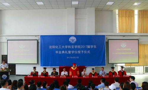 毕业典礼在雄壮的国歌声中拉开帷幕。首先由党总支书记王一女、副校长王喜魁分别宣读2017届学生毕业名单、获得学士学位学生名单、优秀毕业设计论文学生名单、辽宁省优秀毕业生名单、校优秀毕业生名单、2017届考取研究生获校励志奖学金学生名单;之后,学校领导为2017届毕业生代表和获奖学生颁发毕业证书和获奖证书。校长杨化仁为学士学位获得者颁发学位证书并授予学位。