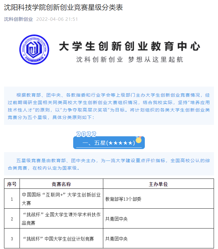 根据教育部、团中央、各教指委和行业学会等上级部门主办大学生创新创业竞赛情况,经过前期调研全国相关同类高校大学生创新创业大赛组织情况,结合我校实际,坚持“培养应用技术型人才”的原则,以“力争夺取高层次奖项”为目标,将计划组织的各类大学生创新创业类竞赛分为五个星级,印发了“云博·(中国)手机网页版创新创业竞赛星级分类表(2022版)”的通知,使全年竞赛开展有计划、有方向、有目标、有成果。