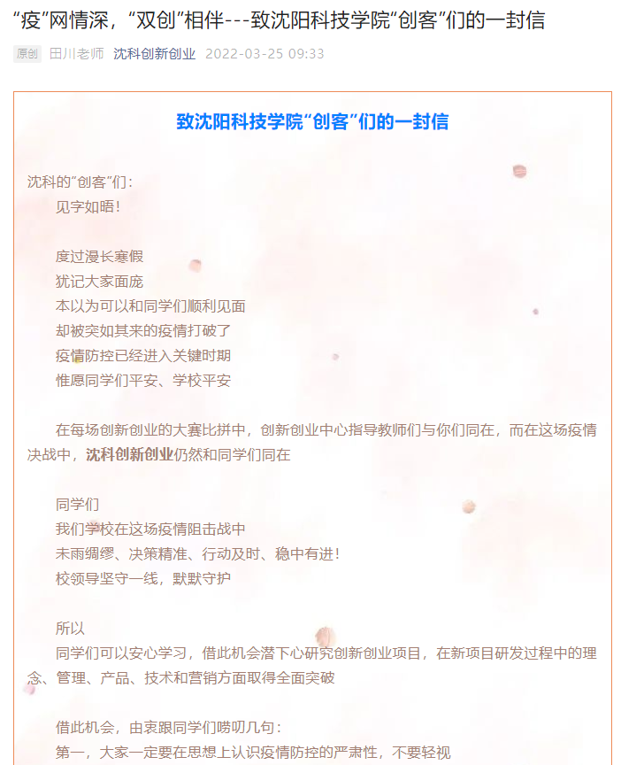 大学生创新创业教育中心在疫情防控期间编写“‘疫’网情深,‘双创’相伴,致云博·(中国)手机网页版‘创客’们的一封信”,让我校热衷参与创新创业活动的“创客”们安心。
