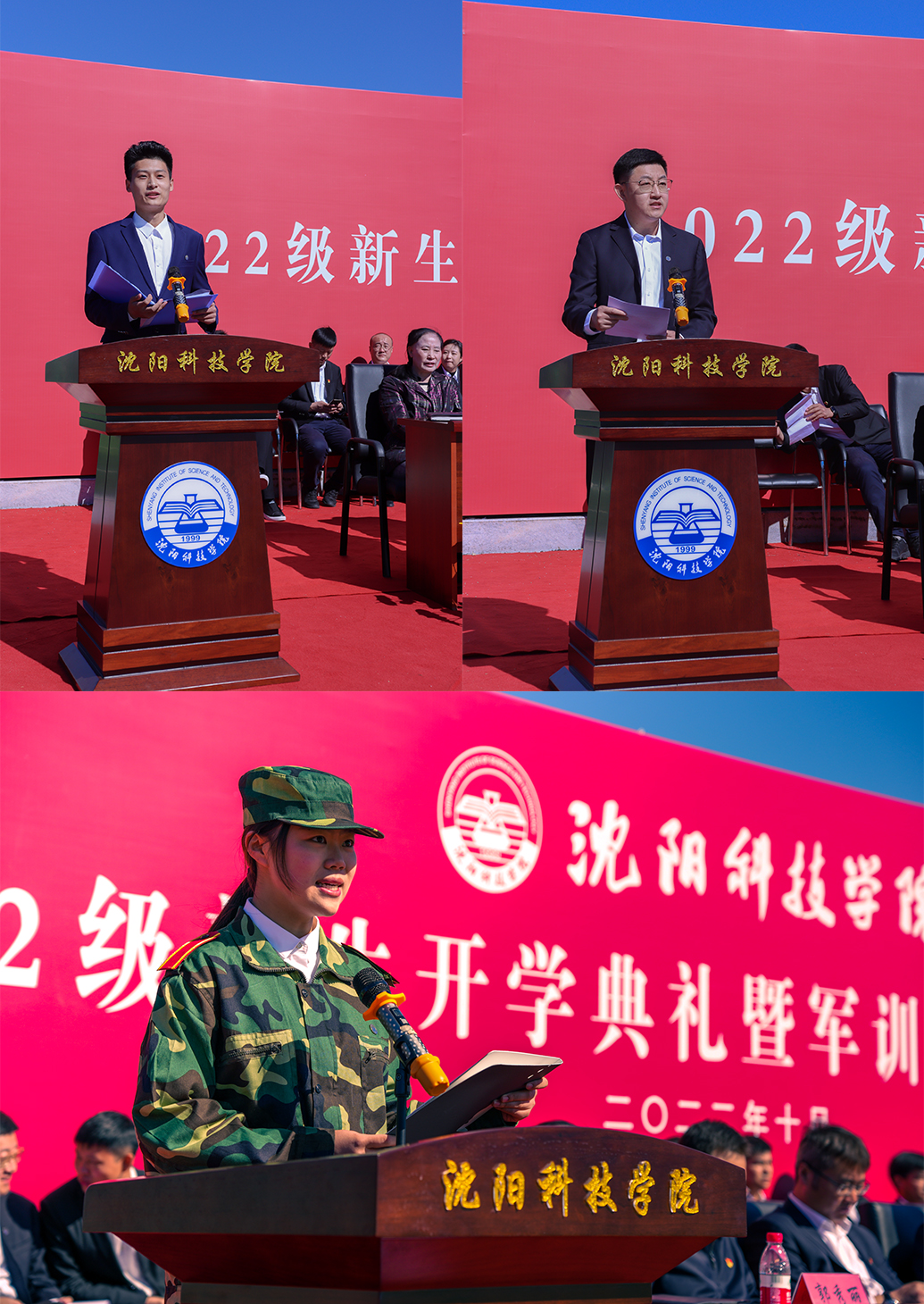 来自化学工程系应用化学专业2201班李政欣同学代表全体新生发言。她表示,请学校放心、请老师放心、请家长放心,定不辜负厚望。在大学四年中将修品德、验本领、有奋斗,努力成为一名有理想、有文化、有纪律的沈科人,以永不言弃的精神状态和一往无前的奋斗姿态担负起时代赋予的重任。在校生代表管理系社会体育指导与管理专业2001班康哲同学用“三个关键词”分享他的大学时光,同时叮嘱学弟学妹们在大学里都能找到自己热爱的事物,关关难过关关过,前路漫漫亦灿灿!