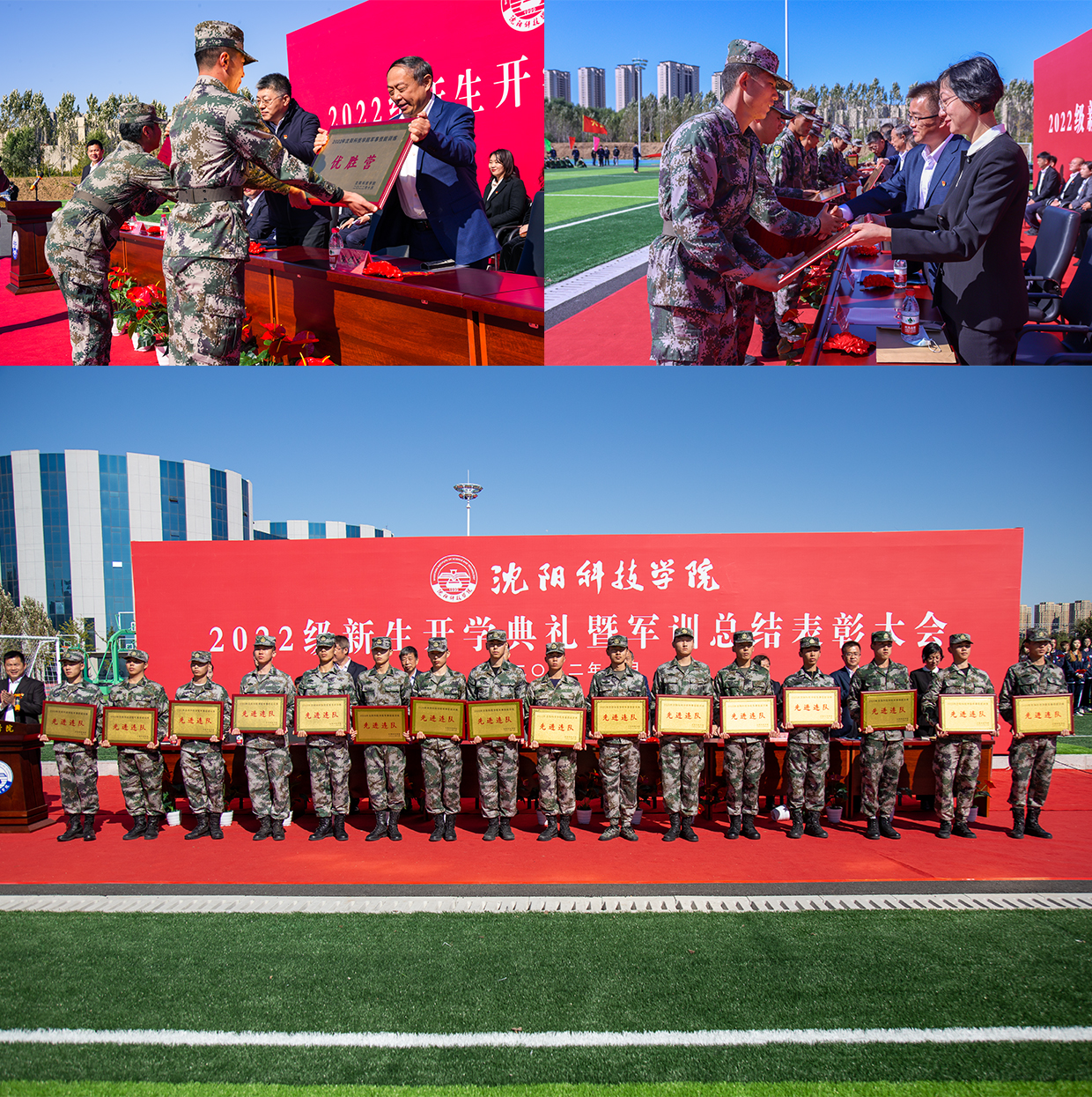 纪委书记、副校长高洪震宣读《关于表彰2022年学生军训先进集体和优秀个人的决定》。校领导依次为获奖集体及个人颁发证书并为新生代表佩戴校徽。