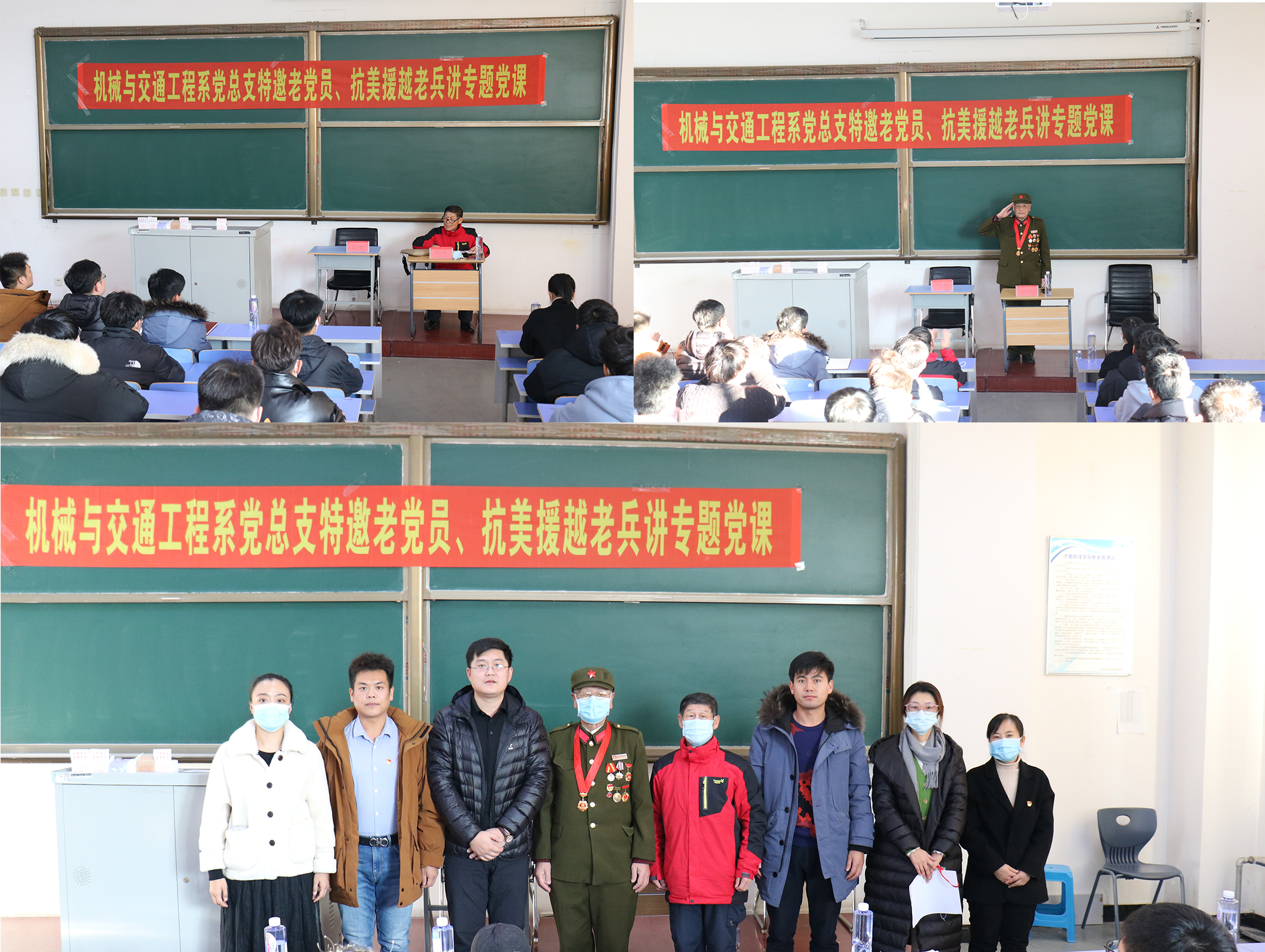 12月1日,机械与交通工程系党总支特邀老党员和抗美援越老兵给总支全体党员及入党积极分子代表上专题党课。本次党课特邀光荣在党50年的原沈阳黎明航空铝门窗工程公司济宁市黎明金属门窗厂厂长李峥,讲述其入党初心以及工作经历,以此来引导和勉励广大党员同志们永葆初心,艰苦奋斗。同时还特邀1963年8月入伍,1965年9月随部队入越作战的抗美援越老兵史庆胜同志。史庆胜同志党龄56年,通过讲述入越作战时的一个个真实、感人的故事,诠释了什么是一名党员,一名党员如何去为人民服务。