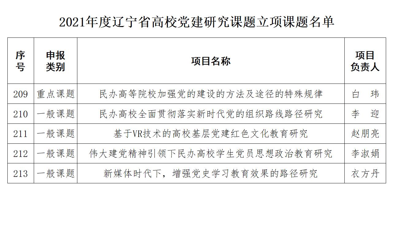 近日,中共辽宁省委教育工作委员会公布了2021年度辽宁省高校党建研究课题立项名单,我校共计获批5项党建课题立项,其中,《民办高等院校加强党的建设的方法及途径的特殊规律》获批重点课题立项,《民办高校全面贯彻落实新时代党的组织路线路径研究》《基于VR技术的高校基层党建红色文化教育研究》《伟大建党精神引领下民办高校学生党员思想政治教育研究》《新媒体时代下,增强党史学习教育效果的路径研究》4个项目获批一般课题立项。这是我校在历年申报辽宁省高校党建研究课题获得立项的最好成绩。这5项课题的成功立项是我校党建理论研究工作持续深化的重要体现,也是我校党建理论与实践紧密结合的集中体现,更是我校基层党组织建设水平不断提升的有效体现。