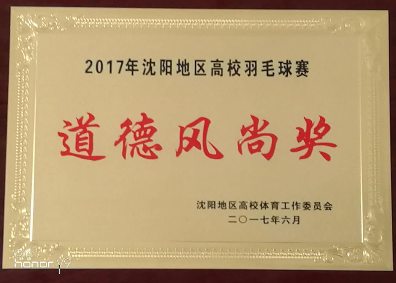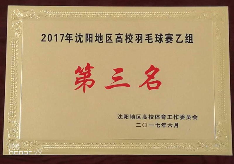 6月3日—4日,我校在2017年沈阳地区高校羽毛球赛中斩获集体与个人多项佳绩:学校被赛会授予道德风尚奖;我校羽毛球代表队获得乙组三等奖;主教练肖士中、刘浩野两位老师获得最佳教练员荣誉称号。