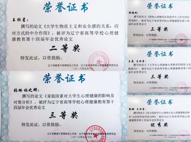 为深入贯彻落实全国高校思想政治工作会议及国家22部委联合印发的《关于加强心理健康服务的指导意见》精神,进一步加强对大学生心理健康教育工作的深入探讨与研究,辽宁省教育厅委托辽宁省高等学校心理健康教育研究会在大连民族大学举办了第十四届年会,并对过去一年各高校的研究成果进行了评奖。我校学生处心理咨询与发展中心经过精心组织、认真筛选,共申报了多项教师作品参加本次评选,其中有5篇论文分获本届年会的二等奖、三等奖和优秀奖。