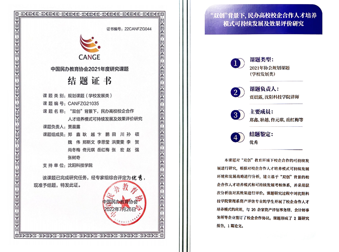 我校管理与传媒系教师贾晨露主持的课题《“双创”背景下,民办高校校企合作人才培养模式可持续发展及效果评价研究》获得中国民办教育协会2021年度规划课题优秀等级中国民办教育协会2021年度规划课题已组织两期结题工作,共评选出八个优秀成果,优秀成果在中国民办教育协会2023学术年会”上展出。
