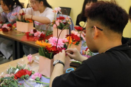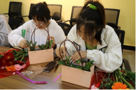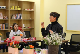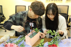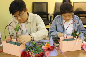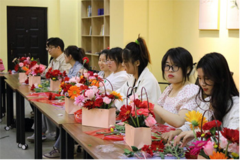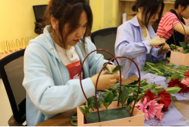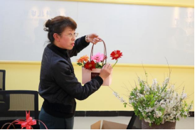 本次插花活动邀请专业花艺师进行授课指导。花艺师为同学们现场介绍鲜花知识,热情的太阳花、富贵的芍药、温情的康乃馨、烂漫的玫瑰、纯粹的小雏菊、清新的尤加利,这些朝气蓬勃的鲜花聚成了一股股热烈的气息。随后,花艺师在花材选择、色彩搭配、视觉形态、摆放位置上进行了详细的讲解,并为同学们演示插花步骤。