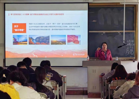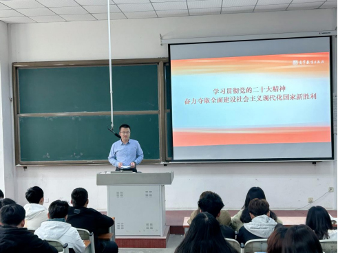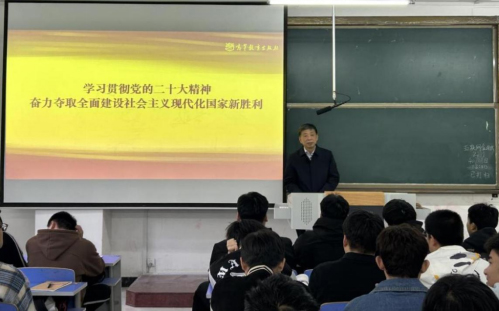 袁德成副校长为学生悉心解读了党的二十大主题,表达了贯彻党的二十大精神是学校当前和今后一个时期首要的政治任务,要把学习贯彻党的二十大精神同提振大学生奋发学习的精气神结合起来。在授课过程中,他贴近社会、贴近学生、贴近实际地对学生进行二十大精神学习方法的指导,课堂气氛活跃。