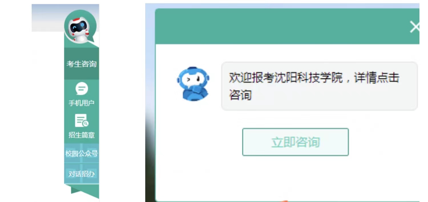 登录学校招生网站http://zhaosheng.syist.cn/,可以通过右侧悬浮栏“智能问答机器人”进行在线咨询、查看学校招生简章、校园公众号等。
