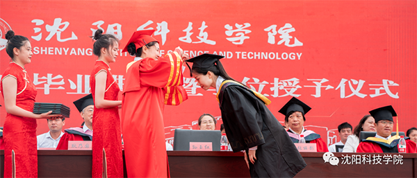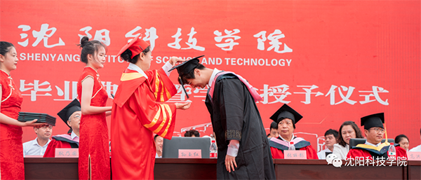 孙玉红校长为学士学位获得者颁发学位证书并为毕业生拨穗正冠。
