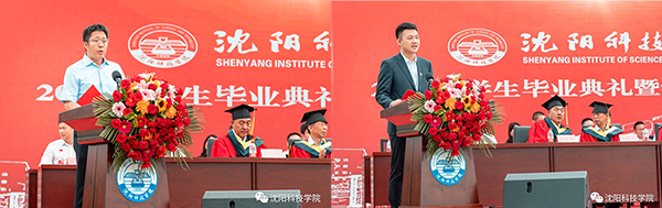 毕业生家长代表、金融学专业于博文同学父亲于永强代表毕业生家长发言;毕业生代表、工商管理专业王嘉鹏同学代表全体毕业生发言。