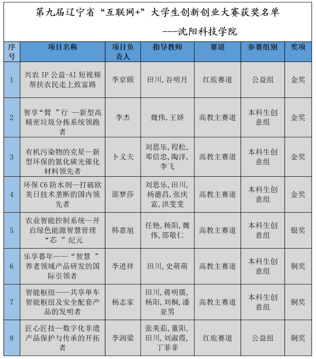 8月8日,“建行杯”第九届辽宁省“互联网+”大学生创新创业大赛圆满落幕,经过网评和现场赛的激烈角逐,我校获得8项省级奖项,分别是金奖4项、银奖1项、铜奖3项,获金奖数量位列全省参赛高校第10位,实现了历史性突破。