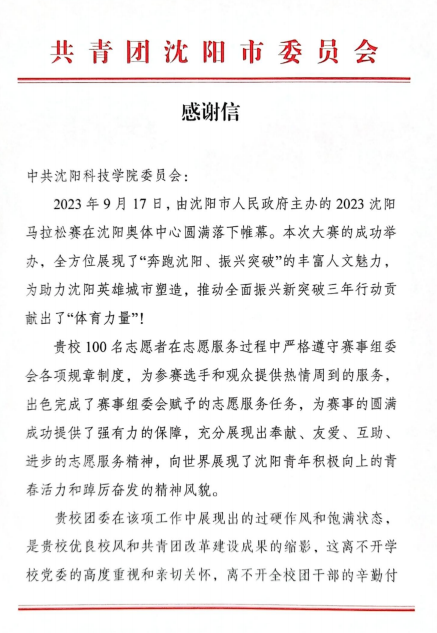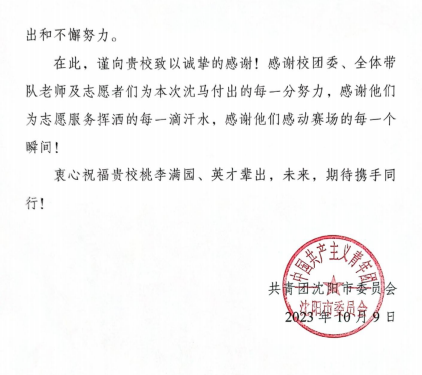 赛后,团市委向我校发来感谢信,表扬我校志愿者在志愿服务过程中严格遵守赛事组委会各项规章制度,展现了奉献、友爱、互助、进步的志愿服务精神,充分展现出沈阳青年积极向上的青春活力和踔厉奋发的精神风貌。