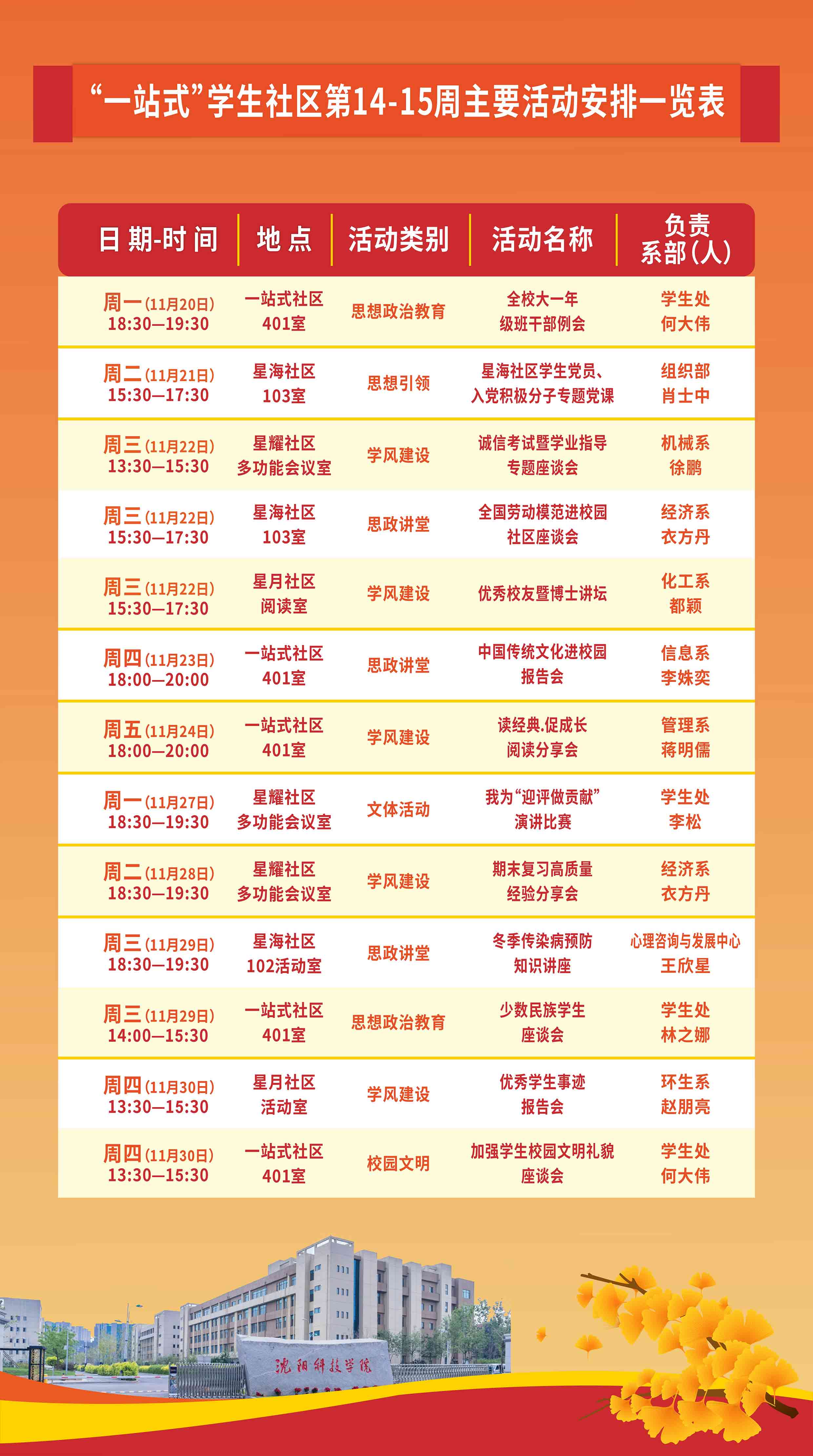 学校从空间保障、配套设施等方面保障“一站式”学生社区综合管理模式建设工作。依托各类学生社区空间建设,将各类教育元素汇集到学生社区,实现将思政优势、学科优势、创新创业优势、师资优势、平台优势等转化为育人优势,多维度推进育人工作进社区,为社区学生提供聆听大师讲座、交流劳动育人、传承雷锋精神等活动平台。打造丰富多彩的学生社区活动,以“周周有活动、天天有提高”为目标,在社区积极开展各项育人活动。