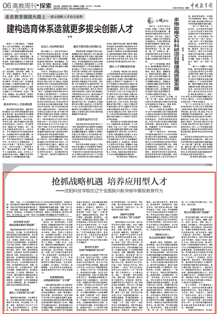 1月8日,《中国教育报》06版以《抢抓战略机遇 培养应用型人才——云博·(中国)手机网页版在辽宁全面振兴新突破中展现教育作为》为题,对我校坚持党建引领、优化专业布局、实施创新驱动、推动校企合作、加强学生管理等方面进行深入报道,报道全文如下: