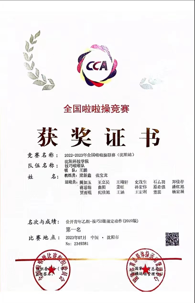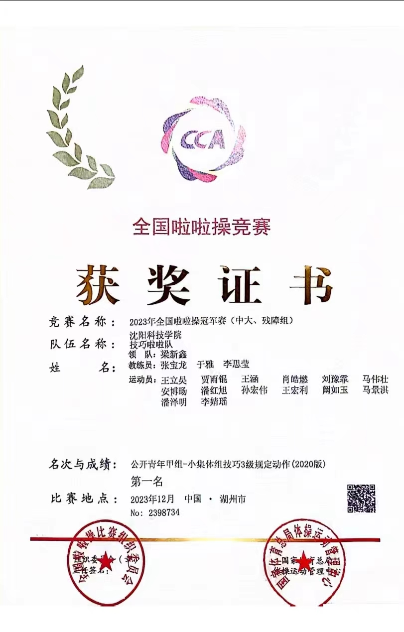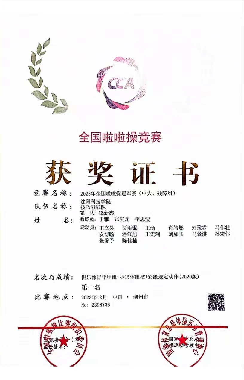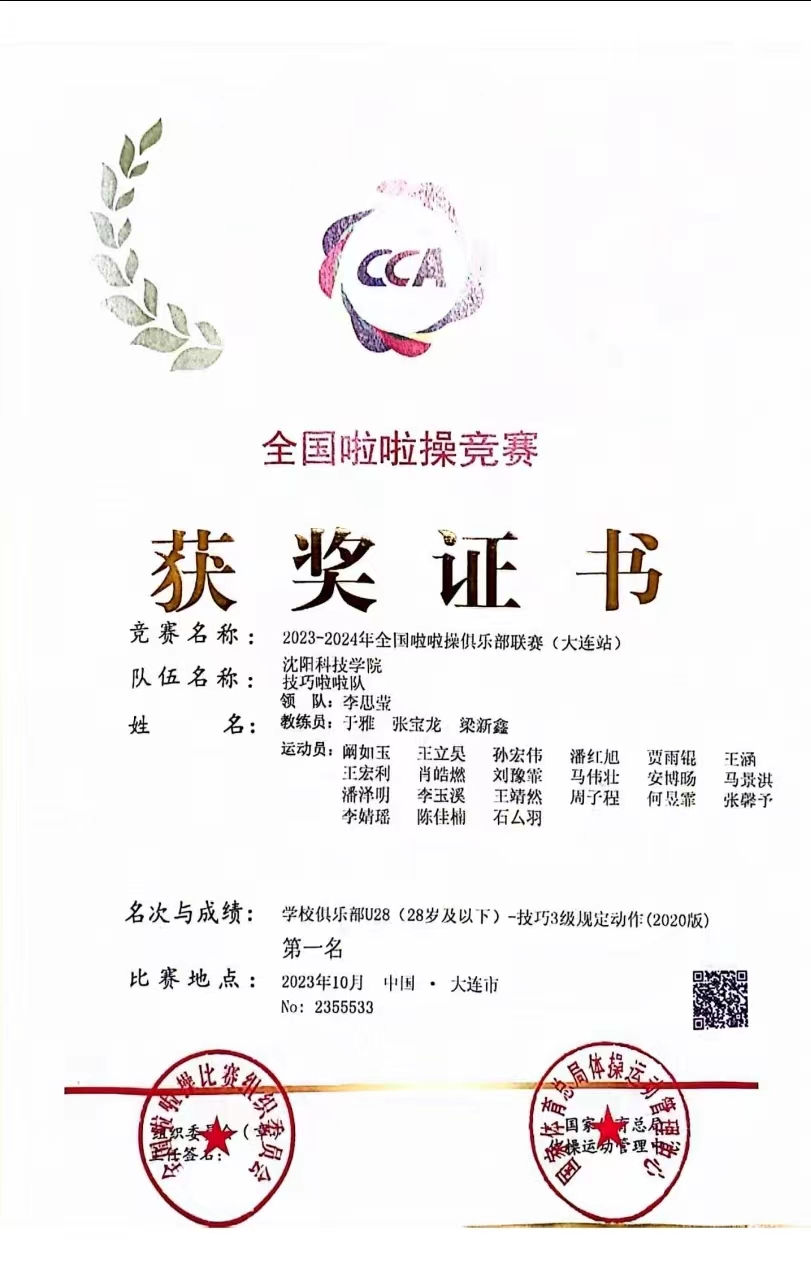 在校期间,她担任班干部及大学生自律委员会生活部部长,她团结同学,为老师分忧,获得“优秀学生干部”、“优秀班级干部”等荣誉。经过自身的不懈努力,多次参加国家、省、市级比赛斩获冠军。训练期间,她严格要求自己的技术动作,并得到教练组老师的一致认可,帮助队伍在2023年全国啦啦操联赛(沈阳站)获得公开青年乙组技巧一级规定动作第一名、公开青年乙组技巧二级规定动作第一名;在2023-2024年全国啦啦操俱乐部联赛(大连站)获得技巧零级规定动作第名、技巧三级规定动作第名;在2023年参加全国啦啦操冠军赛获得公开青年甲组-大集体组技巧零级规定动作冠军、俱乐部青年甲组-小集体组技巧三级规定动作冠军、公开青年甲组-小集体组技巧三级规定动作冠军,打破我校最佳成绩。