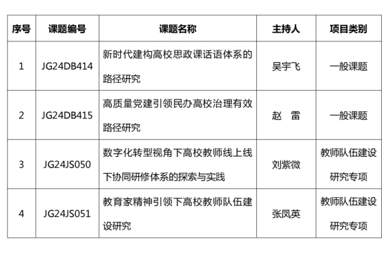 近日,辽宁省教育科学规划领导小组办公室发布了《关于批准辽宁省教育科学“十四五”规划2024年度立项课题的通知》《关于批准辽宁省教育科学“十四五”规划2024年度教师队伍建设研究专项课题的通知》,我校获批2项辽宁省教育科学“十四五”规划2024年度课题、2项辽宁省教育科学“十四五”规划2024年度教师队伍建设研究专项课题。具体名单如下: