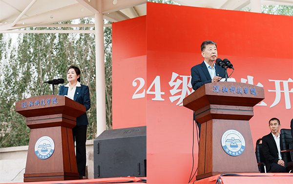党委副书记、校长孙玉红作了题为《乘风破浪 拔节成长 奋力在开新局中逐梦远行》的讲话。孙玉红指出,全体新生经历军训的洗礼,完成了开学第一课的成功蜕变,在此她向全体新生提出三点希望。一要坚定理想信念,永立鸿鹄志。古之立大事者,不惟有超世之才,亦必有坚忍不拔之志。要注重在仰望星空中坚定理想信念,传承好红色基因,在脚踏实地中增加自己的人生厚度,不辜负韶华,不怠慢时光,在志存高远、奉献社会、成就梦想中书写无愧于自己、无愧于时代的青春华章。二要矢志求学问道,永做奋斗者。学习是提高能力素质、砥砺意志品格、涵养静气定力的过程,希望同学们始终把学习当作一个永恒的主题,把学习从单纯的求知变为生活的方式,保持读书好学、勤于思考的良好习惯,像海绵汲水一样汲取专业知识,不断提升专业能力,在拼搏奋斗中不断赶超自我。三要崇尚修身立德,锤炼真本领。要涵养正己修身的道德修为,心有所畏、言有所戒、行有所止,不断锤炼意志力、坚韧力、自制力,争做德才兼备的新时代优秀大学生。要懂得感恩,多向传道授业解惑的老师寻求真本领,在提升能力、修身养德中夯实人生之基。希望同学们用奋斗书写精彩人生,用拼搏成就青春梦想。