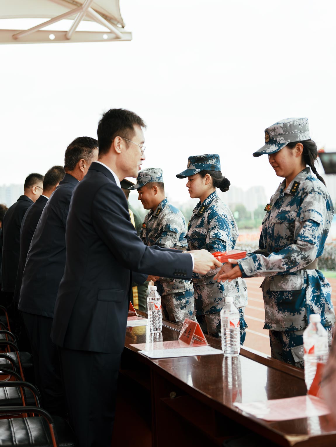 校领导袁德成、张丽影、王鸿鹏、郭秀丽、张磊、肖士中分别宣读关于表彰2024年学生军训优胜营、先进连队、优秀教官、内务卫生优秀寝室、内务卫生优秀个人的决定。随后,校领导为获奖集体和个人颁奖。