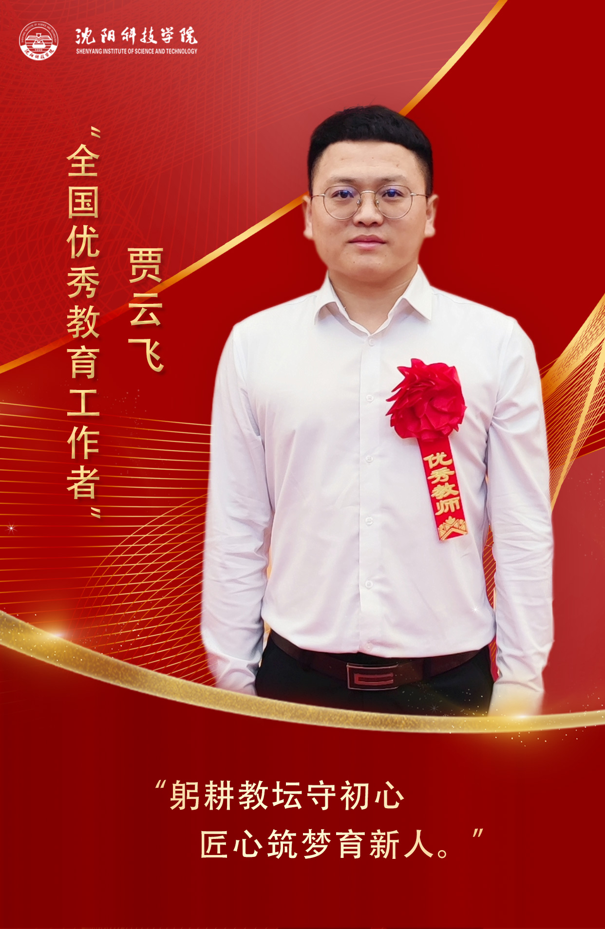 贾云飞从事学生工作10年来,始终坚守为党育人、为国育才的初心使命,主动担当培根铸魂、启智润心的时代重任。他深入开展思想政治教育与研究,直面大学生思想政治教育的热点和难点问题编著书籍,发表思政类学术论文20篇,省、市级课题10余项;重视网络思政教育,撰写育人网文260余篇,围绕“思想引领、网络育人、关爱帮扶、学业指导”四个维度,尽心尽力开展“德、心、学、能”育人工作。同时,他积极践行学校办学理念,将抗美援朝精神融入思想政治教育实践路径,切实提升抗美援朝精神育人实践成效;不断强化创新创业教育教学能力和素养,将创新精神、创业能力与实践技能培养纳入育人范畴,赋能学生成长成才。从教以来,他始终致力于成为学校教育教学、人才培养、科学研究和服务社会等内涵建设的中坚力量,为沈科高质量发展做出更大贡献。