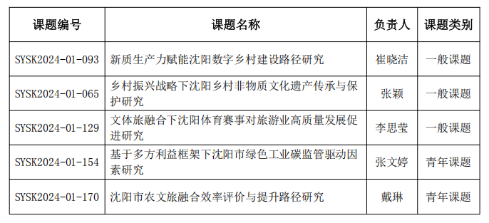 近日,沈阳市社会科学界联合会发布了《关于公布沈阳市社会科学课题立项名单的通知》,我校《新质生产力赋能沈阳数字乡村建设路径研究》等5个项目成功获批2024年度沈阳市社会科学课题立项,具体名单如下: