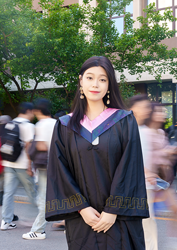 少年身着学士服,穿梭在校园楼宇间
