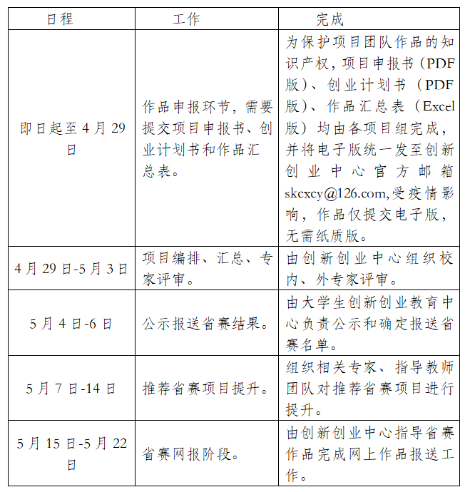 3.各系部、各组织部门要重点挖掘毕业3年之内校友的项目,整合各类技术资源和社会资源,形成高质量的参赛作品。