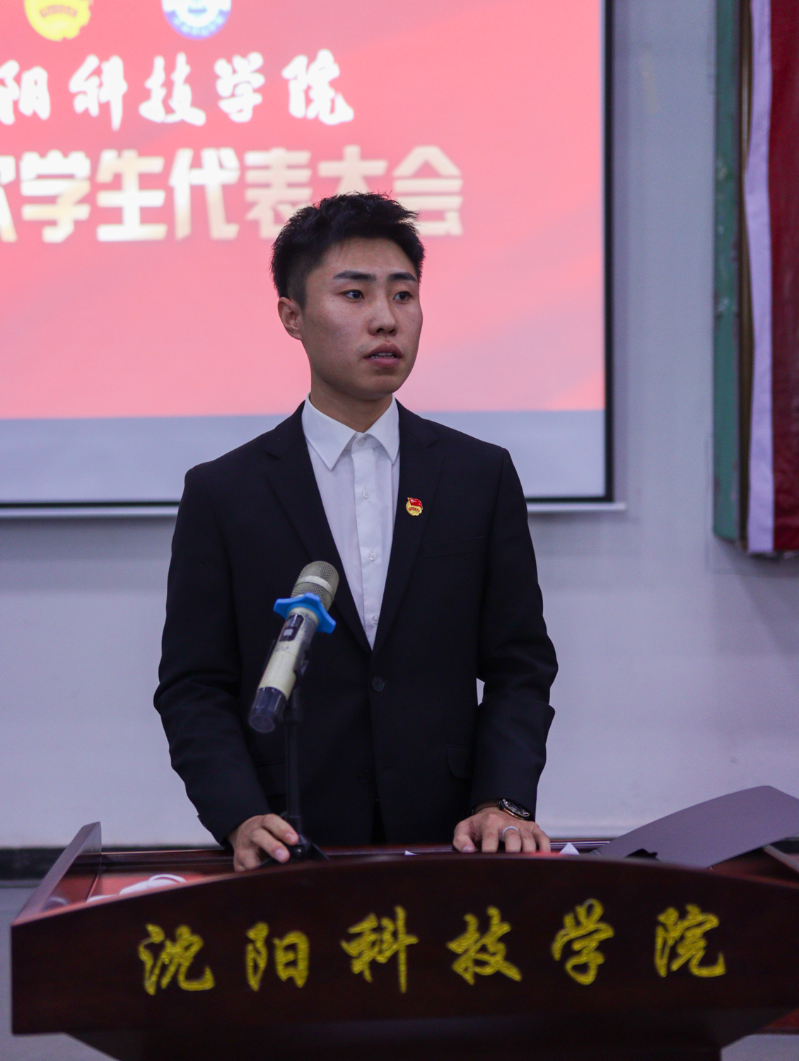 李金宇同志代表沈阳市学联讲话,他对大会的召开表示热烈祝贺,向出席大会的各位代表和广大学生致以诚挚的问候。他充分肯定了我校团委在大学生思想引领、校园文化建设、成长成才服务等方面所取得的成果,并在会上提出三点希望和要求,一是要深入贯彻落实党的二十大、团的十八大和学联二十七大的精神,高举中国特色社会主义伟大旗帜,深入学习习近平总书记纪念五四运动100周年大会上的重要讲话精神;二是要紧跟学联、学生会改革步伐,结合工作实际,不断加强自身建设,切实推进学生会改革向纵深发展;三是要坚持学生主体地位,密切联系同学,积极引导同学,竭尽全力服务同学,团结带领广大同学,践行“请党放心,强国有我”的青春誓言。