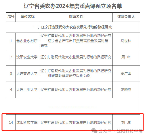 近日,中共辽宁省委农村工作领导小组办公室公布了《关于2024年度重点课题立项的通知》(辽农领办〔2024〕22号),我校成功获批1项“辽宁打造现代化大农业发展先行地的路径研究”方向的重点课题。
